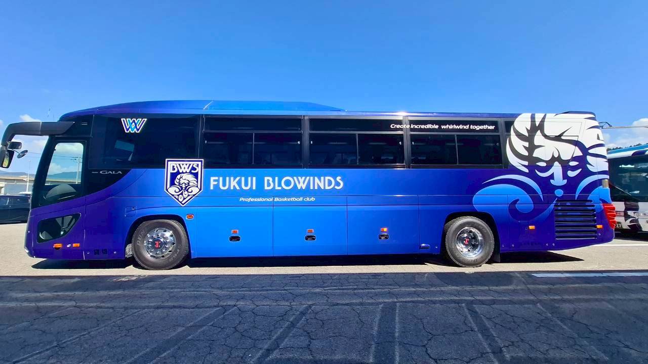 街を走る福井ブローウィンズ仕様のラッピングバス(運行バス会社:永平寺観光)が登場。