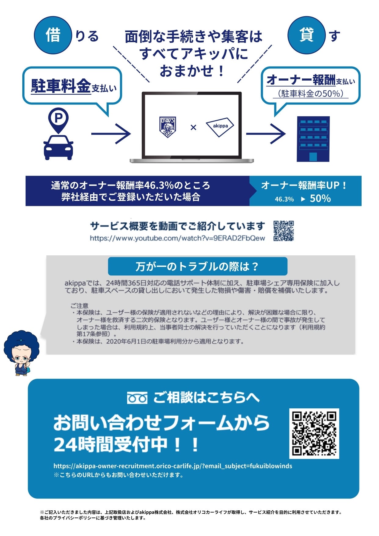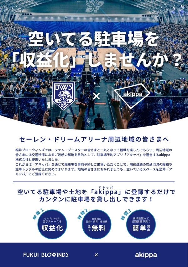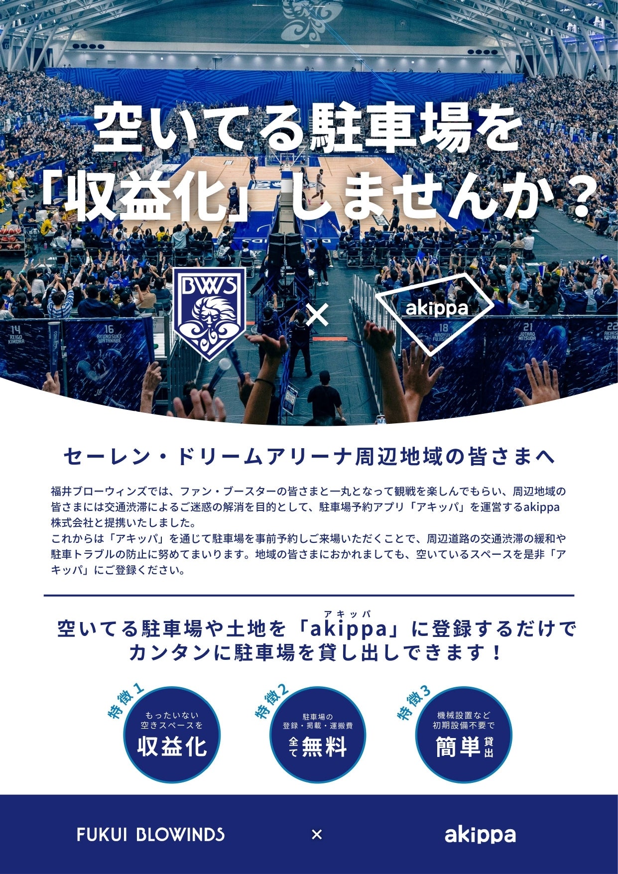 福井ブローウィンズは、試合日に発生する駐車場不足を解消し、来場者に快適な観戦体験を提供するため、駐車場シェアリングサービス「akippa」と連携しています。