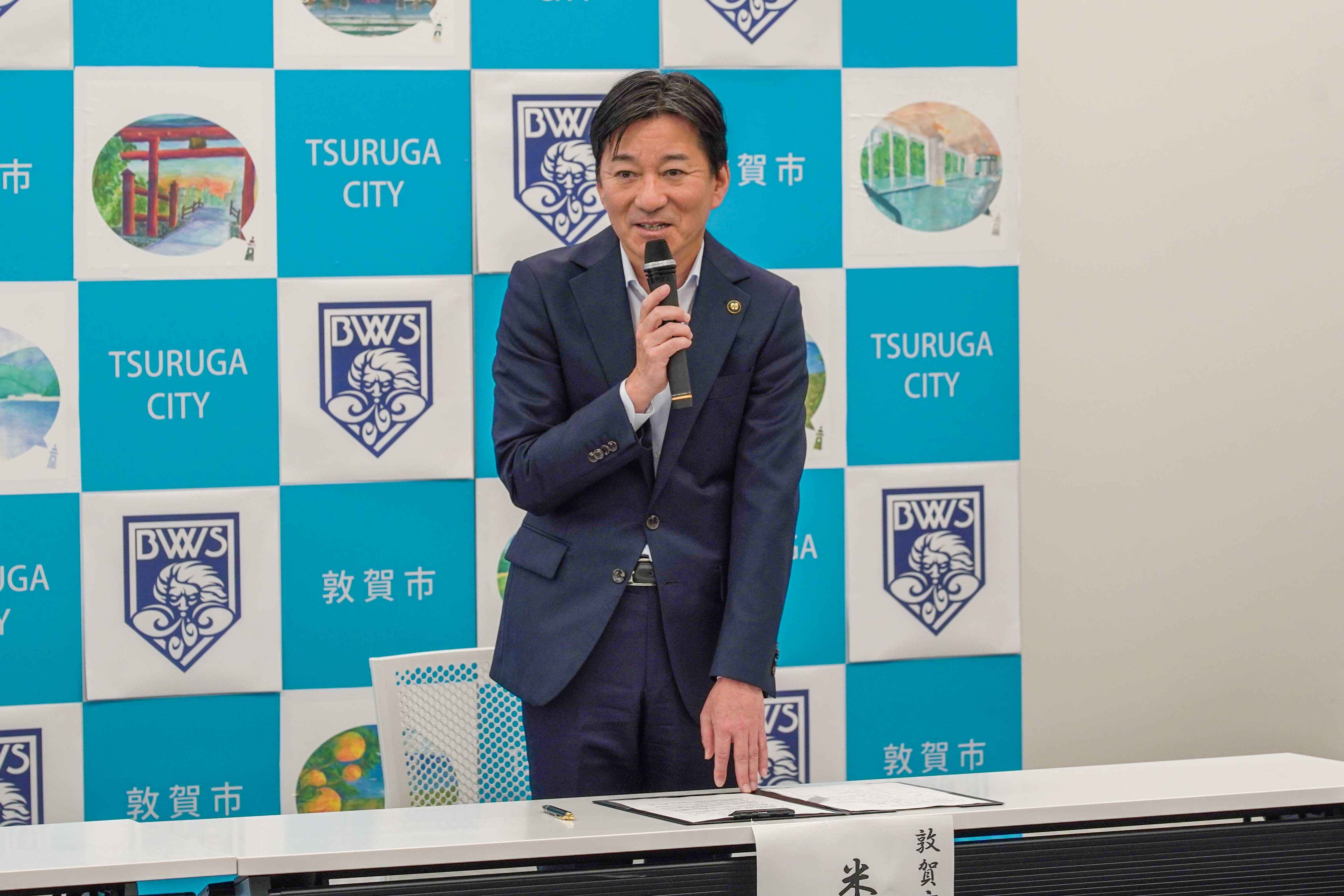 当日は、米沢 光治 敦賀市長、福井ブローウィンズ 代表取締役 湯本 眞士 が出席し、ご挨拶の後に連携協定書への署名を行いました。