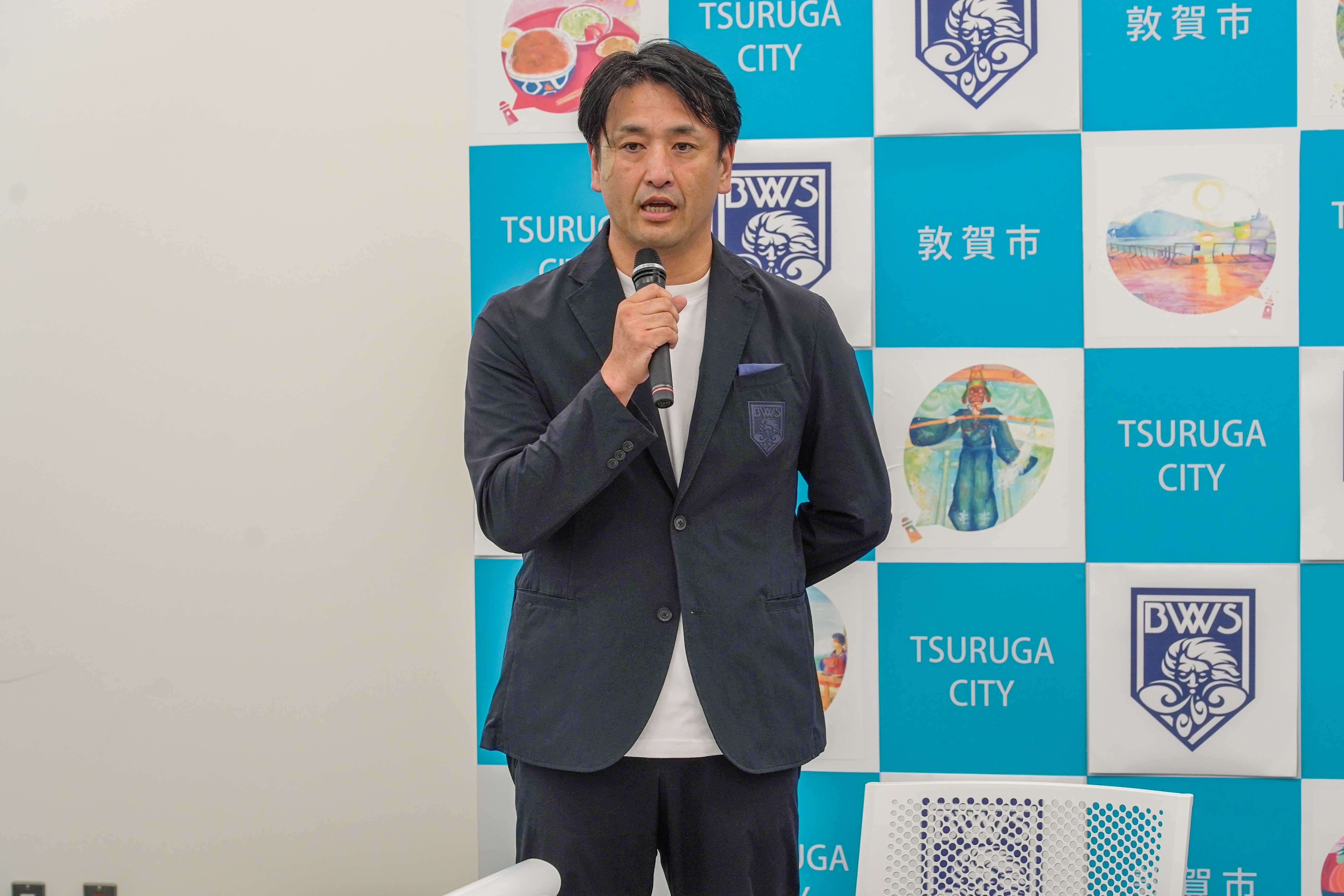 湯本代表取締役より、11月の敦賀市での試合を控え、敦賀市での賑わいの創出と、今後の取り組みについてお話しさせていただき、締結式の最後にはポスターをお手渡しさせていただきました。