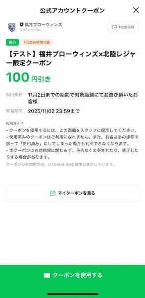 上記期間までに、福井ブローウィンズ公式LINEアカウントにご登録いただいた方に対して、本日以降にクーポンを配信いたします。