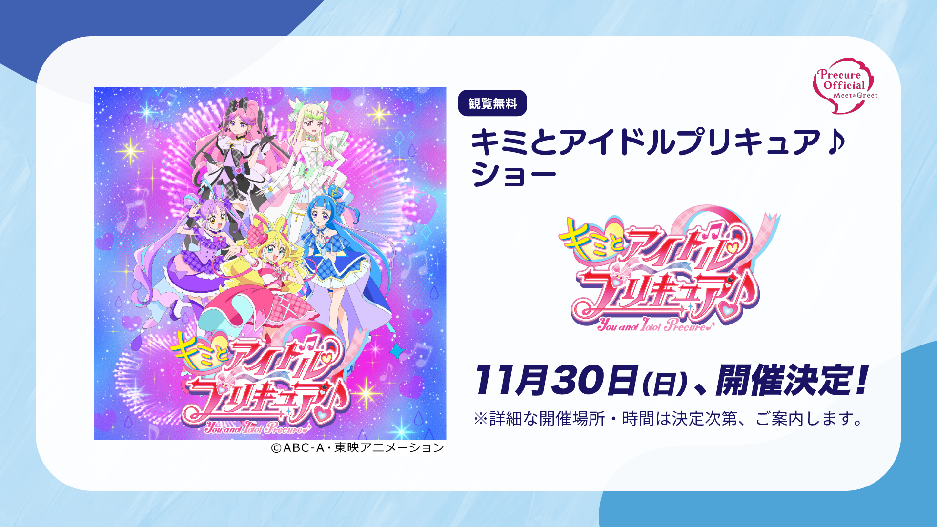 11月30日(日)に「キミとアイドルプリキュア♪ ショー」の開催が決定いたしましたので、お知らせいたします。