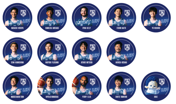 2025-26シーズン在籍選手とBOOZの写真に、今シーズンのスローガン『LIGHTUP』がプリントされた缶バッジ