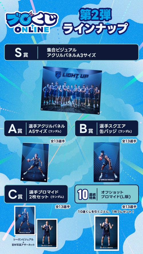 第2弾では、2025-26シーズンスローガン“LIGHT UP”をコンセプトに撮り下ろしたシーズンビジュアルデザインの景品をラインナップ。