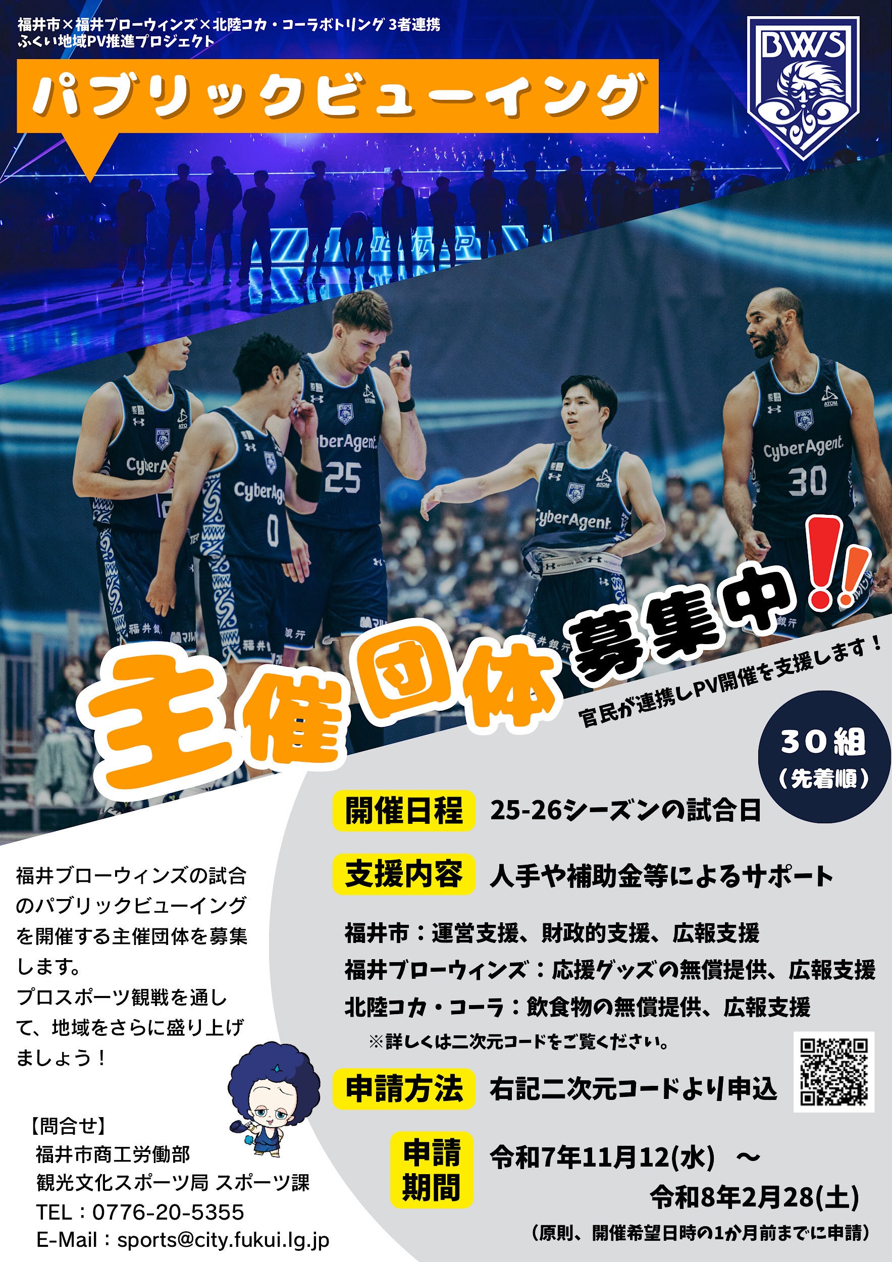 この度、福井市、北陸コカ・コーラボトリング株式会社、株式会社福井ブローウィンズの3者が協働して、 福井市内の市民団体が福井ブローウィンズのパブリックビューイング開催を地域で開催する際の運営サポートや、広報協力、飲食・応援グッズの提供などを行う新プロジェ クトが始動することとなりましたので、お知らせいたします。