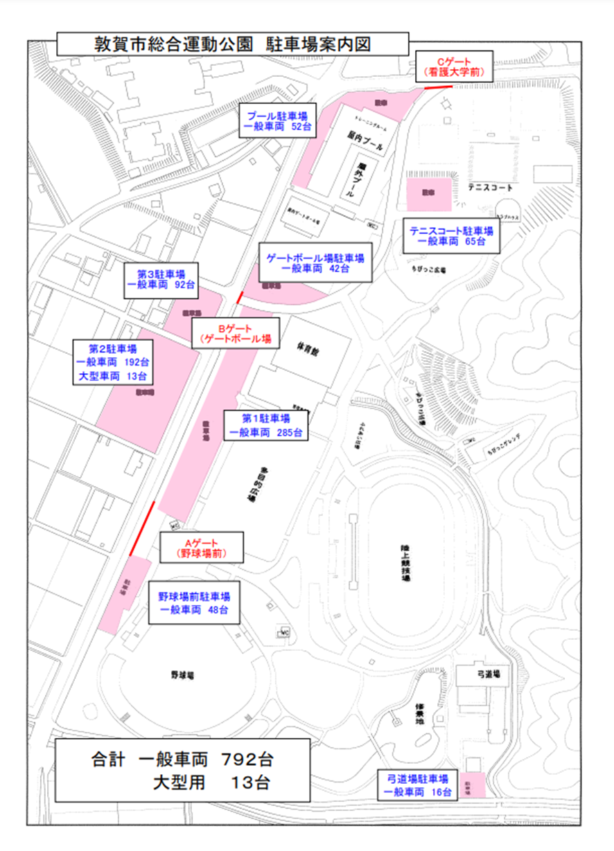 なお、臨時駐車場は、敦賀市総合運動公園内の駐車場が満車になった時点でのご利用が可能となりますので、ご了承ください。