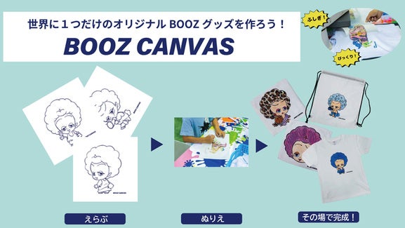 マスコットキャラクター「BOOZ」の塗り絵を描き、その場でTシャツやハンドタオル、ナップサックなどに描いた絵を圧着することができる「BOOZキャンバス」。“自分の描いたBOOZ”がグッズとして持ち帰ることができる特別な体験をぜひお楽しみください!