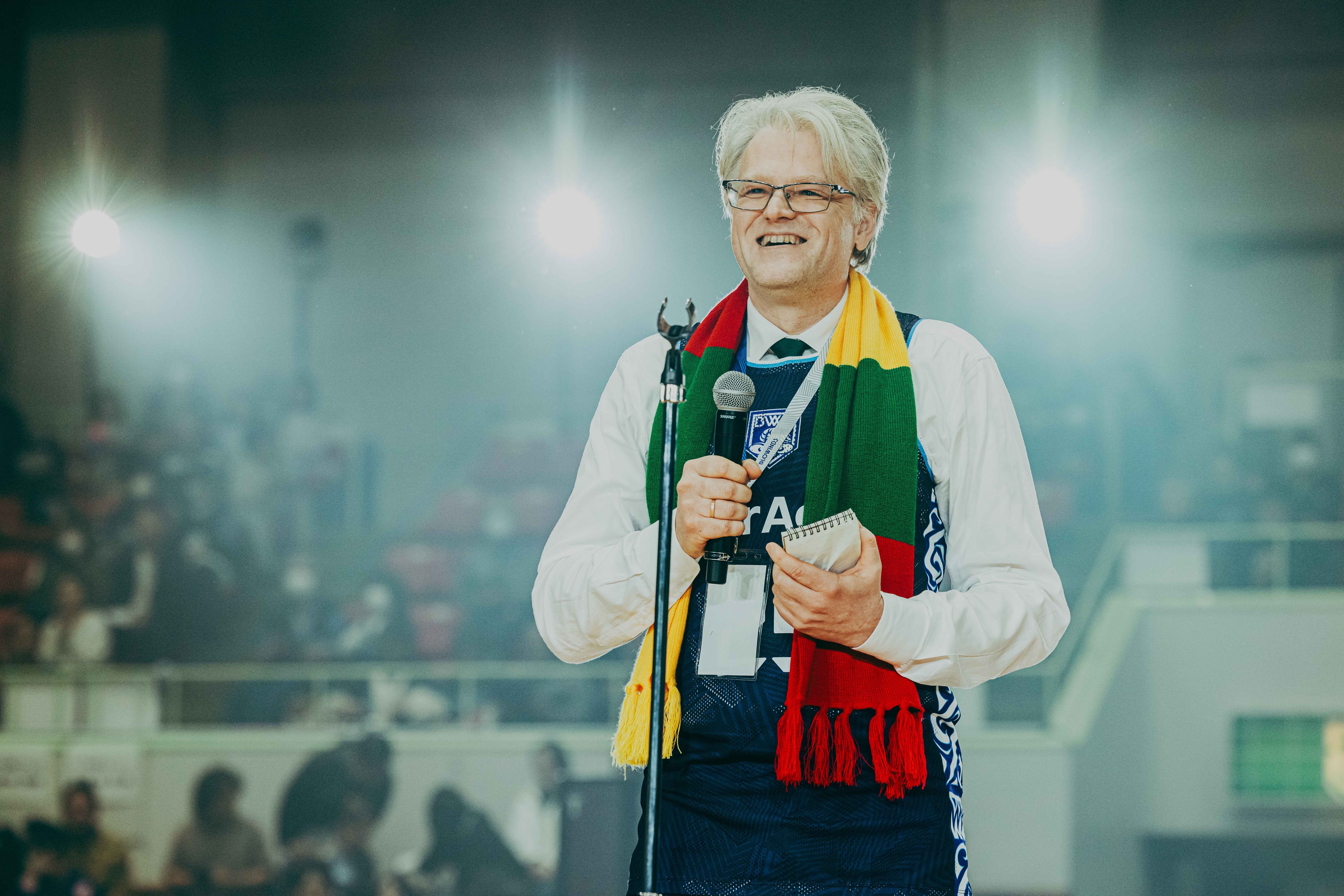 試合前にオーレリウス大使よりご挨拶を賜りました。リトアニアと敦賀の歴史的な関係について言及いただいた後、福井ブローウィンズ・ラポラス選手への激励のメッセージをいただきました。