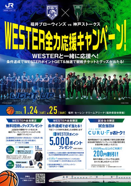 この度、2026年1月24日(土)、25日(日)にセーレン・ドリームアリーナ(福井県営体育館)にて開催される「りそなグループ B.LEAGUE 2025-26 シーズン」第17節 vs 神戸ストークスの試合において、JR西日本グループと連携し、WESTER会員限定で抽選で観戦チケットやオフィシャルグッズが当たるプレゼント企画を実施することになりましたので、お知らせいたします。