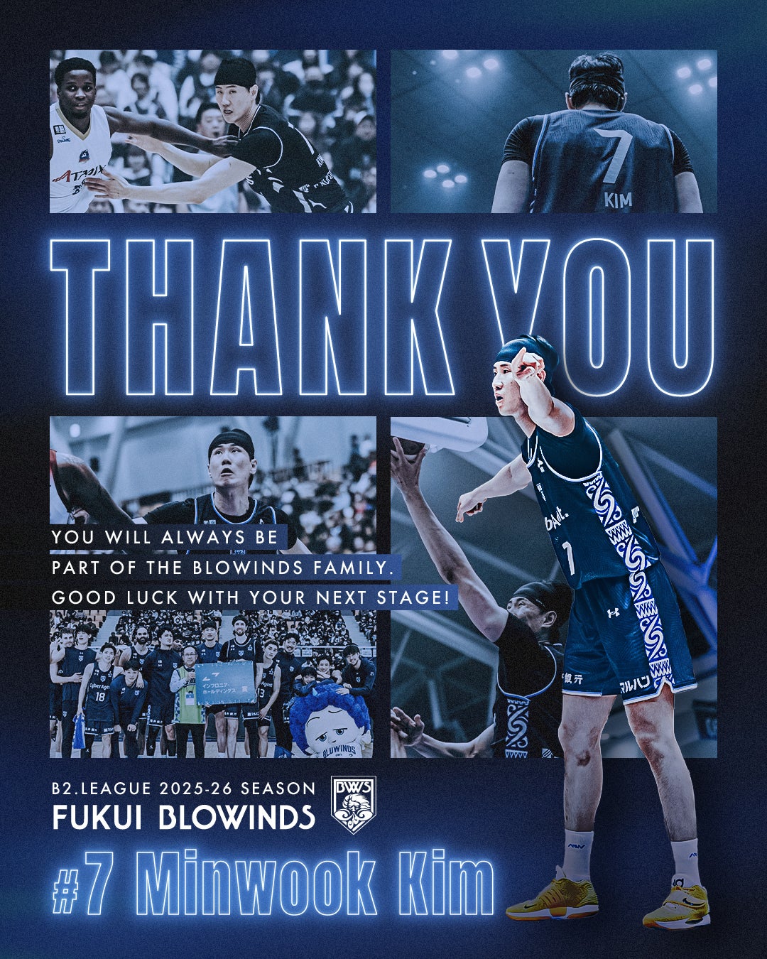この度、福井ブローウィンズでは、#7 キム・ミンウク 選手との選手契約が2026年1月4日をもって満了となり、退団することが決定しましたので、お知らせいたします。