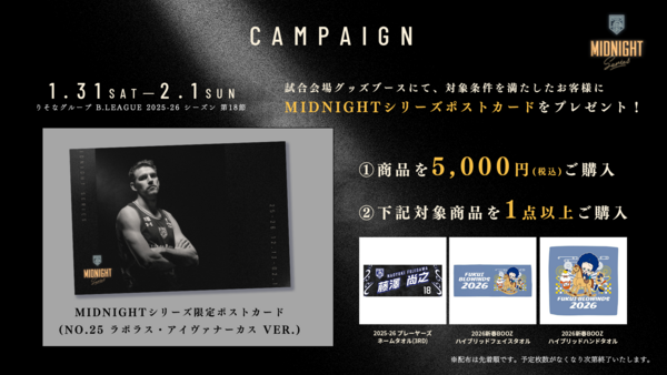 この度、2026年1月31日(土)、2月1日(日)にセーレン・ドリームアリーナにて開催される「りそなグループ B.LEAGUE 2025-26 シーズン」第18節にて、グッズを5,000円(税込)ご購入、または対象商品をご購入で「Midnightシリーズ限定ポストカード(No.25 ラポラス・アイヴァナーカスver.)」がもらえるキャンペーンを開催します!