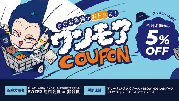 ホームゲーム当日、対象のグッズブースにてお買物をされたBWZRS 無料会員 または、非会員のお客様に、その日のうちに使える「ワンモアクーポン(5%OFF券)」をプレゼント。