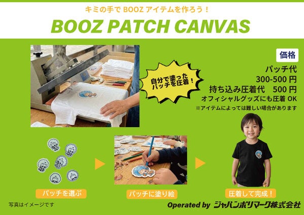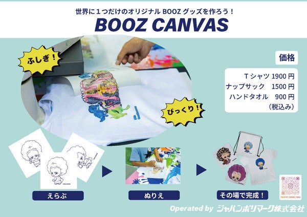 マスコットキャラクター「BOOZ」の塗り絵を描き、その場でTシャツやハンドタオル、ナップサックなどに描いた絵を圧着することができる「BOOZキャンバス」。“自分の描いたBOOZ”がグッズとして持ち帰ることができる特別な体験をぜひお楽しみください!