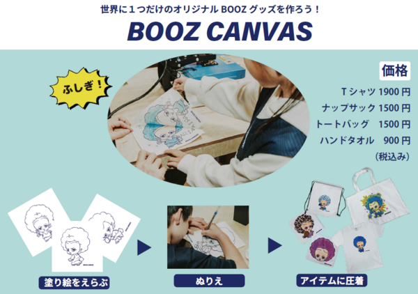マスコットキャラクター「BOOZ」の塗り絵を描き、その場でTシャツやハンドタオル、ナップサックなどに描いた絵を圧着することができる「BOOZキャンバス」。“自分の描いたBOOZ”がグッズとして持ち帰ることができる特別な体験をぜひお楽しみください!