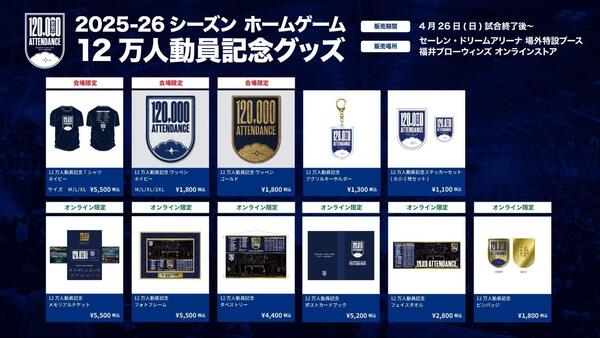 本記録が達成された場合、4月26日(日)試合終了後より 「ホームゲーム12万人動員記念グッズ」を販売することが決定いたしました。